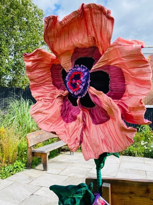 This sculpture is based on the ‘Harlem’ Oriental Poppy, which is a perennial flower with large, beautifully colourful petals. I was inspired to create this poppy due to its bright, crepe papery petals and intricate detail to introduce families and visitors to new types of flowers as part of the community trail at Maindee Festival.